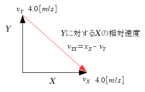 $Y$の速さを4.0[m/s],$X$の速さを4.0[m/s]としたとき,$Y$から見た$X$の速さを求めなさい。