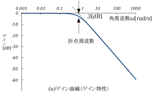 図6.1.17に一次遅れ系のゲイン曲線と位相曲線を示します。ゲイン曲線で示す点線を伸ばすと、ちょうどω=1で交わります。この周波数を折点周波数と呼びます。この周波数のとき3[dB]減少しています。同図(b)に示す位相曲線での折点周波数のときの位相遅れは-45°となります。この45°のときの傾きを伸ばしていくと、折点周波数の0.2倍と5倍のところと交差します。ゲイン曲線も位相曲線も、この点線のように折点近似が可能となります。