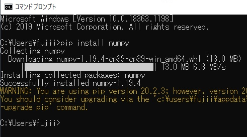 数値計算のライブラリnumpyをインストールします。