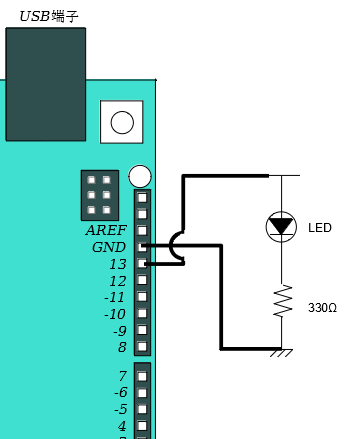 LEDを図のように接続します。LEDは通常2V程度の電圧で点灯します。5Vの出力になりますので、300Ω程度の抵抗を接続します。